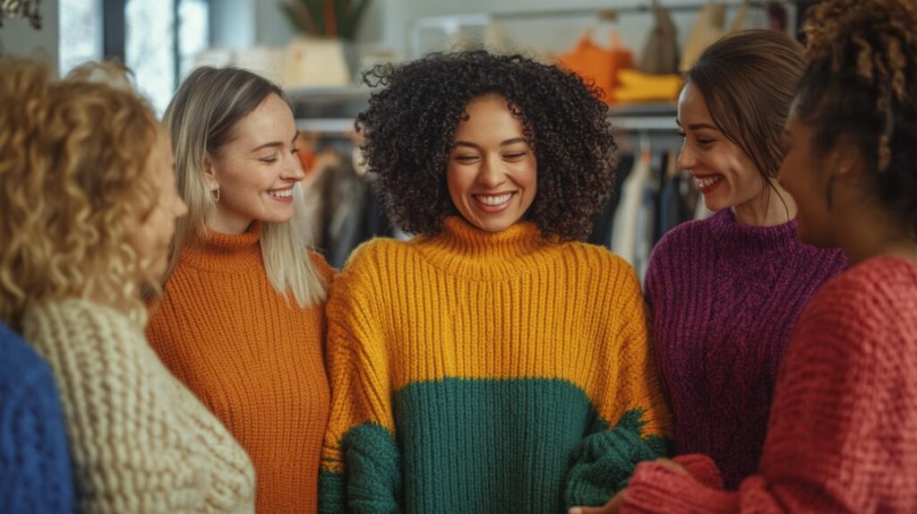 Pour les femmes à la morphologie en A, l'objectif principal consiste à équilibrer la silhouette en attirant l'attention vers le haut du corps. Les pulls à col roulé sont particulièrement recommandés car ils apportent du volume au niveau des épaules et de la poitrine. Les modèles avec des détails sur le haut, comme des épaulettes légères ou des manches chauve-souris, créent également un équilibre visuel intéressant. Les pulls de couleurs claires ou à motifs sur le haut associés à des bas plus sombres permettent de rééquilibrer les proportions. Pour la silhouette en V, privilégiez au contraire les coupes qui minimisent les épaules tout en apportant du volume au niveau des hanches. Les pulls col V sont vos meilleurs alliés car ils allongent le cou et affinent visuellement le haut du corps. Les modèles cintrés à la taille qui s'évasent légèrement vers le bas sont également parfaits pour créer des courbes là où vous en avez besoin. Évitez les épaulettes et les cols trop volumineux qui accentueraient le déséquilibre. Les femmes avec une morphologie en H peuvent se permettre plus de fantaisie. Les pulls oversize leur vont particulièrement bien car ils créent une silhouette décontractée et moderne sans souligner l'absence de taille marquée. Les modèles asymétriques sont également intéressants car ils cassent la ligne droite et apportent du mouvement. Pour créer l'illusion d'une taille, vous pouvez opter pour des pulls bi-matières avec une ceinture ou une bande contrastante au niveau de la taille. La silhouette en X, naturellement équilibrée, peut se permettre pratiquement tous les styles. Les pulls cintrés sont vos meilleurs amis car ils soulignent votre taille marquée et mettent en valeur vos proportions harmonieuses. Les modèles ajustés, qu'ils soient courts ou de longueur classique, fonctionnent parfaitement. Vous pouvez également oser les coupes plus originales tout en veillant à maintenir la définition de votre taille. Enfin, pour les morphologies en O, l'objectif est de créer une silhouette allongée et d'éviter d'ajouter du volume. Les pulls à col V sont particulièrement flatteurs car ils allongent le buste et créent une ligne verticale amincissante. Privilégiez les matières fluides qui tombent joliment sans mouler excessivement. Les pulls de longueur moyenne qui arrivent au niveau des hanches sont idéaux, tandis que les modèles trop courts ou trop longs peuvent déséquilibrer la silhouette. Les coupes droites légèrement cintrées sont préférables aux modèles trop amples qui ajouteraient du volume inutile.